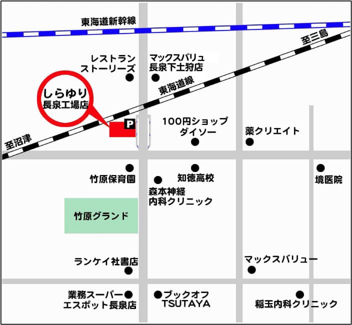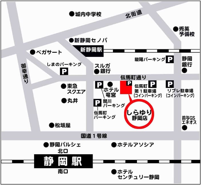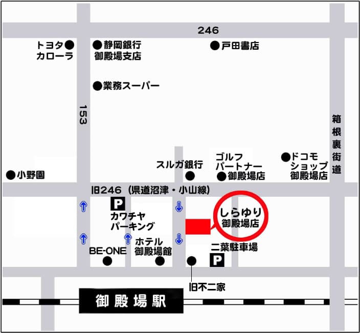 しらゆり沼津店 しらゆり御殿場店 しらゆり静岡店 しらゆり長泉工場店 しらゆり沼津店 定休日 毎週水曜日※6~12月は第3火曜日も休みになります。 営業時間 10:00 ~ 19:00 TEL (055)951 - 6908 住所 〒410-0801 静岡県沼津市大手町5-3-4 アクセス方法沼津駅南口側、駅前大通りに面したお店になります。ホテル三交イン(旧丸井)3軒隣り又は靴のワシントン2軒隣りです。駐車場は沼津市商店街連盟契約の駐車場ならどこでもご利用できますが、地図に記載の駐車場が近くて便利です。※駐車券をお出しします。 しらゆり御殿場店 定休日 毎週水曜日 ※6~12月は第3火曜日も休みになります。 営業時間 10:00 ~ 19:00 TEL (0550)82 - 2130 住所 〒412-0043 静岡県御殿場市新橋1979 アクセス方法御殿場駅前通りに面したお店になります。前の通りは一方通行になりますのでご注意下さい。駐車場は駅前の二葉駐車場又はカワチヤパーキングをご利用下さい。※駐車券をお出しします。 しらゆり静岡店 定休日 毎週水曜日 ※6~12月は木曜日も休みになります。 営業時間 10:00 ~ 19:00 TEL (054)653 - 1140 住所 〒420-0858 静岡県静岡市葵区伝馬町10-25 アクセス方法伝馬町通りに面したお店になります。マイホテル竜宮の2軒隣りになります。駐車場は店の前(1~2台のスペース)、関川パーキング、伝馬町第1駐車場、リブレ駐車場が近くて便利です。 しらゆり長泉工場店 定休日 日曜・祝日定休 ※1~5月は土曜営業 6~12月は土曜も休みになります。 営業時間 9:00 ~ 18:00 TEL (055)972 - 0003 住所 〒411-0944 静岡県駿東郡長泉町竹原327-1 アクセス方法長泉中央通り高架下脇のお店になります。入口部分から一方通行になりますので、南側よりお越し頂くと入りやすくなっています。駐車場は工場店前に数台分スペースが有り、交通量も少ないので止めやすく便利です。※工場店前に車を止められます。 平28年9月店舗改装して、キレイになりました!